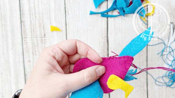 Now it’s time to add your stuffing! Use small pieces of polyester filler or scrap felt. For tricky spots like the head, you can use the back of a pencil to help push the filling in. Once your bird is nicely stuffed, use the blanket stitch to close up the opening and knot everything off securely back where you started sewing.