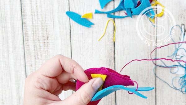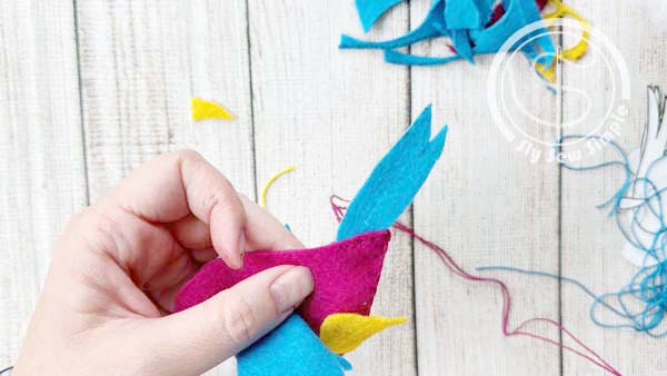 Next, let’s attach the wings and feet. Place the wing pieces on either side of the bird’s body piece. Thread your needle again and use another simple knot stitch to secure them in place. Then, do the same with the feet pieces.