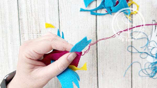 When you reach the area for the tail, simply place it between the two body pieces of felt and sew it in place using a running stitch.