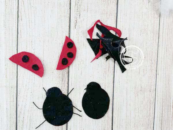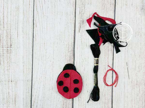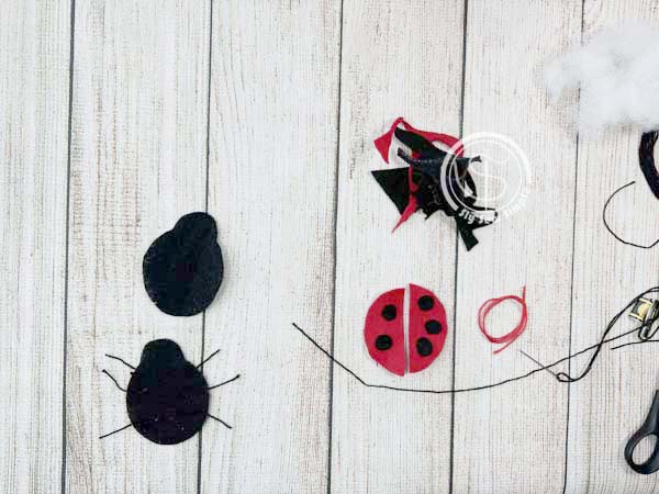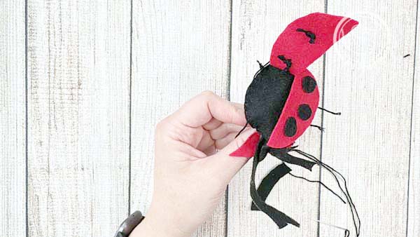 Attach the black felt spots to the ladybug’s back using a single knot stitch for each spot, then attach the wings to the back of the top lady bug piece with another single knot stitch at the top corner of each wing.