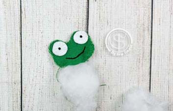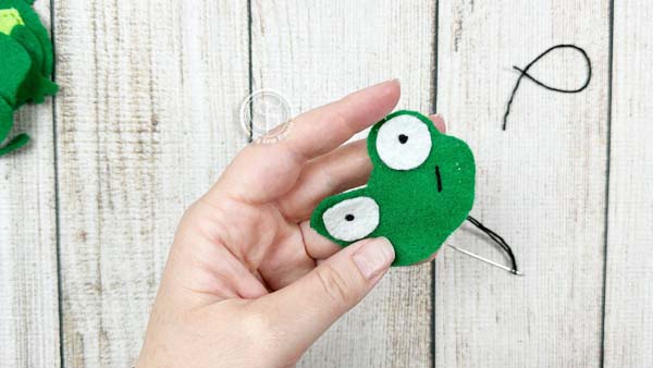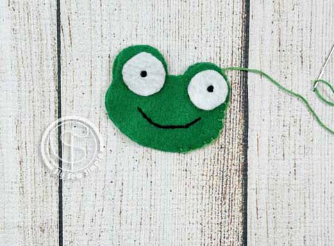 Place the felt eye circles where you want them on the frog’s face. Use knot stitches to sew each one on.
