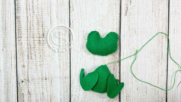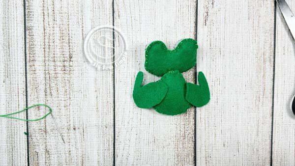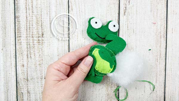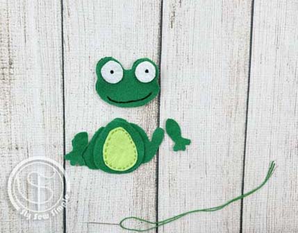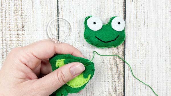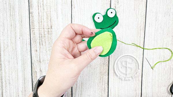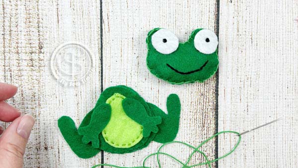 Line up the frog’s belly onto the front body piece. Use a running stitch to attach it.