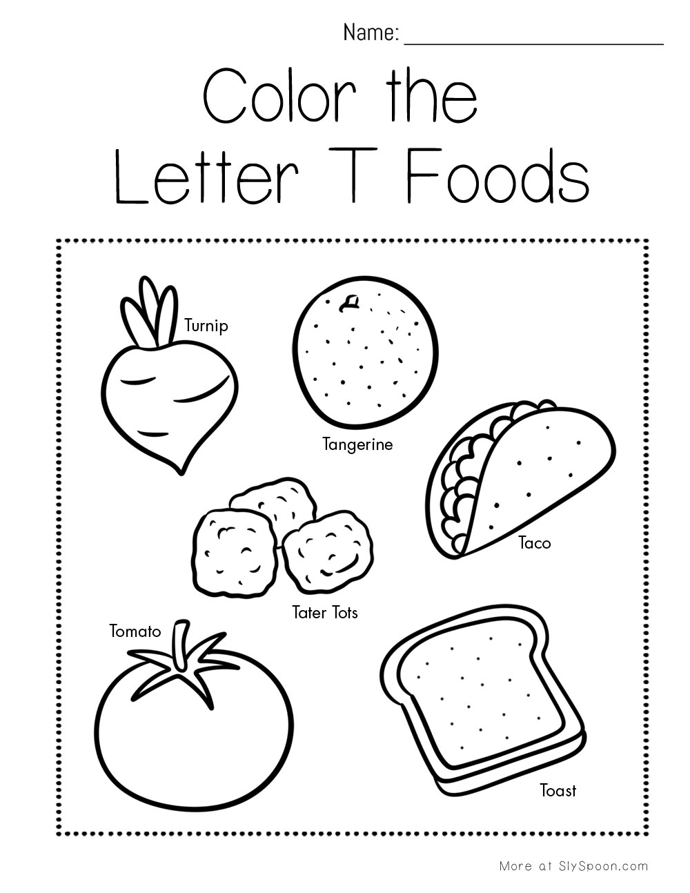 - Color the Letter T Foods – Includes labeled coloring images like tomato, toast, tea sandwich, and taco.