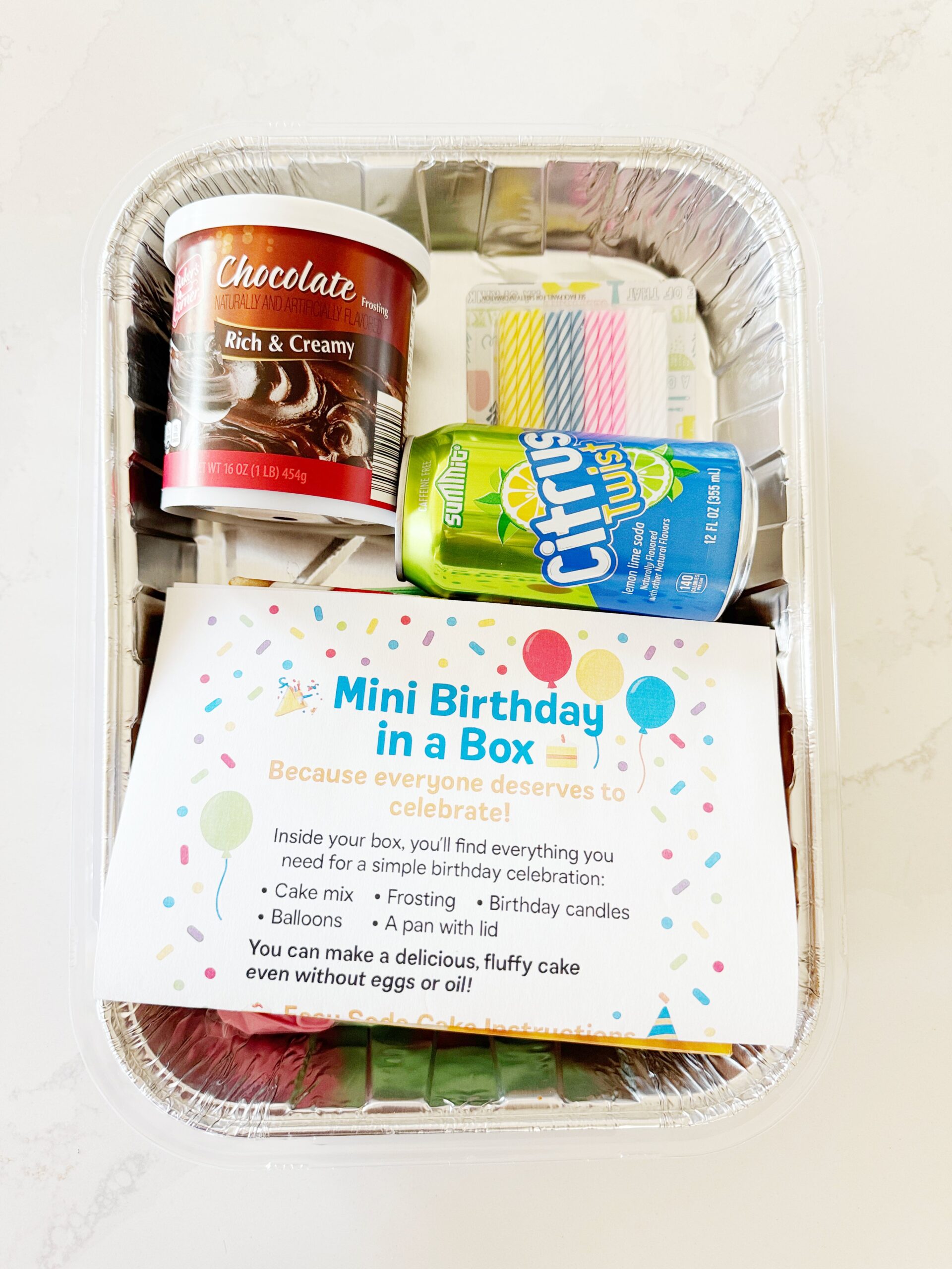 I also created a free printable to explain the simple cake instructions, because I worried the can of soda might be confusing, I didnât want families thinking it was just a fun beverage (though if they have eggs and oil it certainly can be!) The printable makes the kit feel clear, intentional, and easy for anyone to use.
