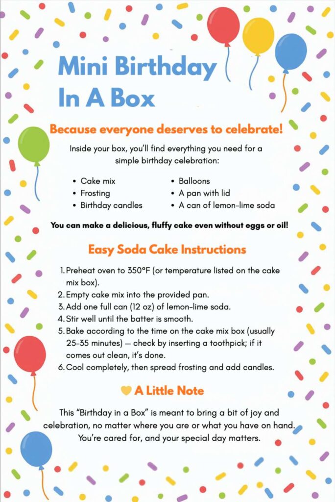 One incredibly thoughtful woman shared that she also made birthday kits, and she added a small gift card so parents can choose something special for their child. That idea touched me deeply. Even a $5â$10 card can give families agency and dignity during a moment thatâs meant to be joyful.