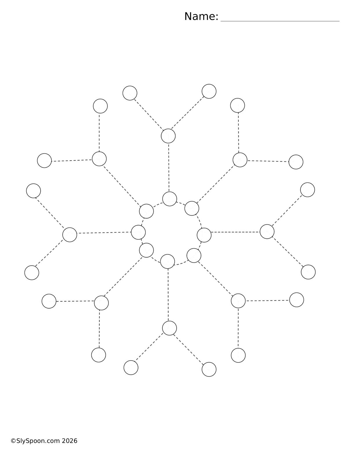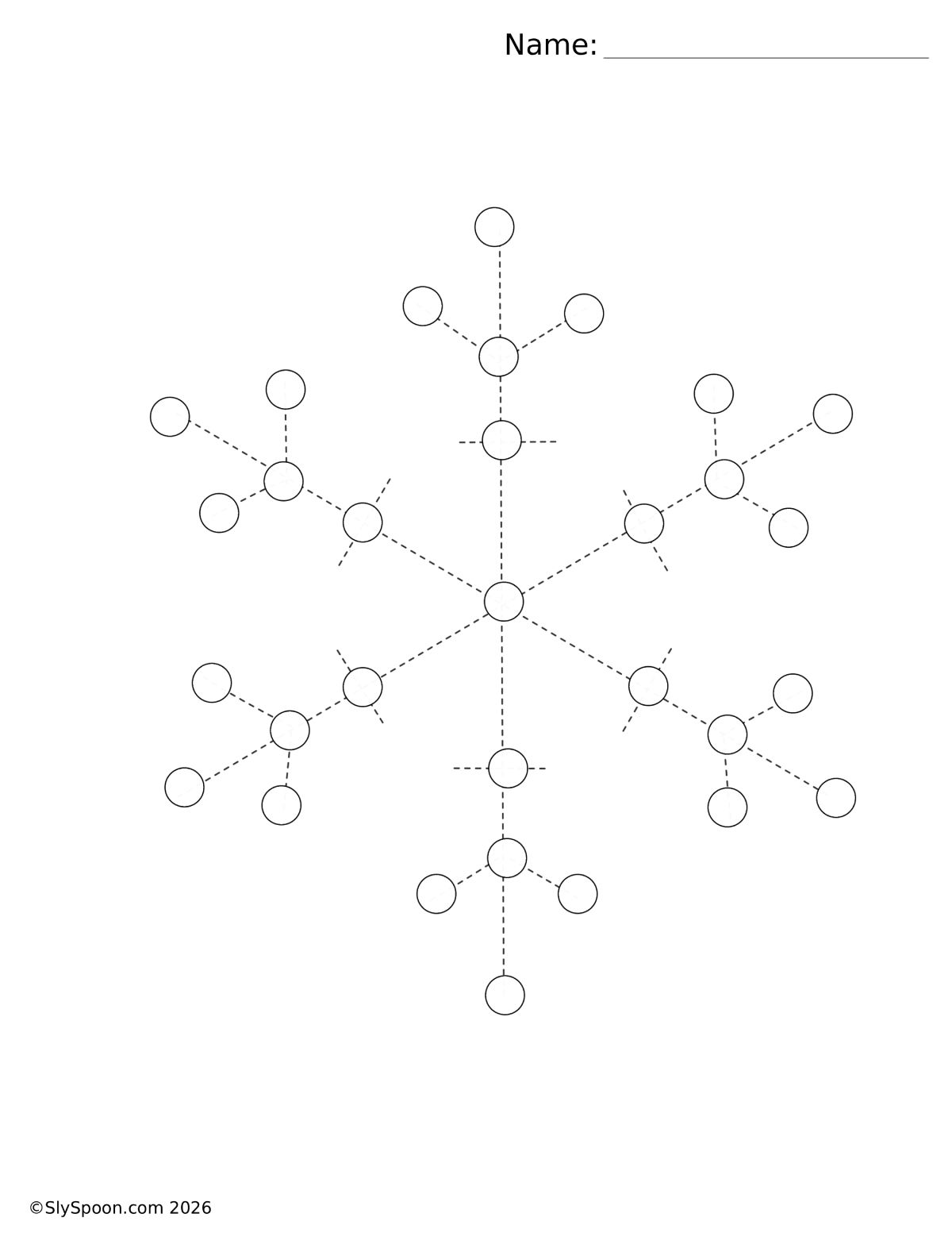 I designed three snowflake patterns made up of dotted circles. Kids can paint each circle with a Q-tip dipped in paint or use finger painting for a sensory experience. Older children can use the dotted lines as tracing paths to practice fine motor pencil control.