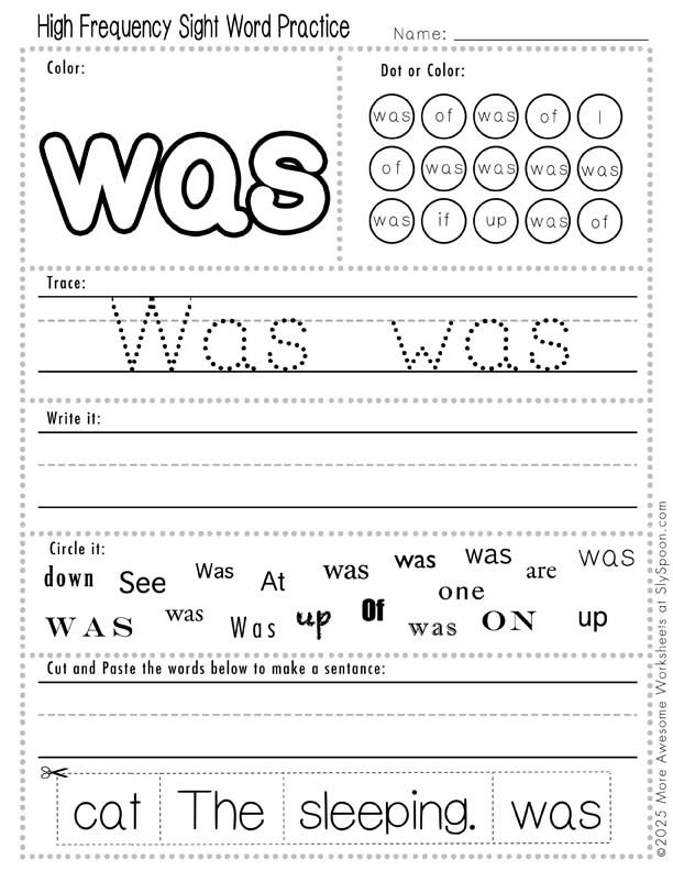These “Was” sight word worksheets are easy to print and use anytime. Try them for: