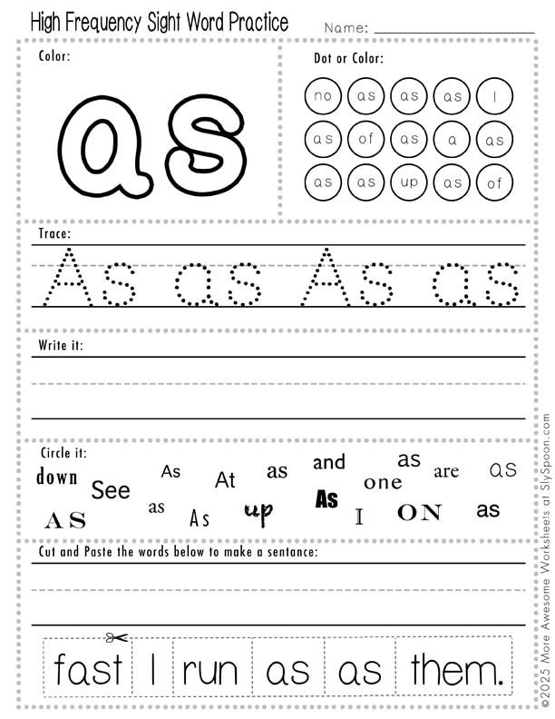 This multi-skill worksheet lets kids trace the sight word as, trace and read a simple sentence using it, and then trace and color a picture that matches.
