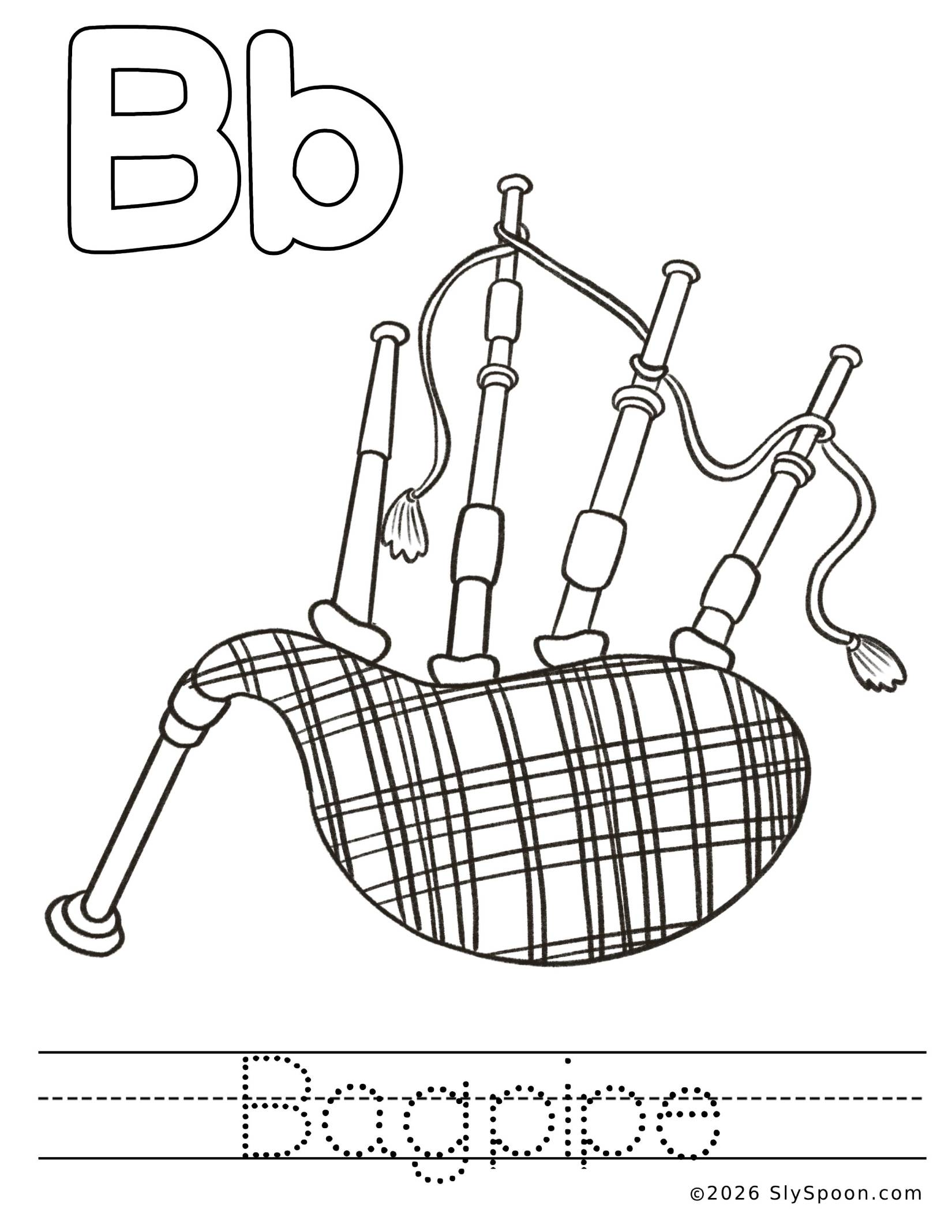 - Trace the word “bagpipes” using dotted letters