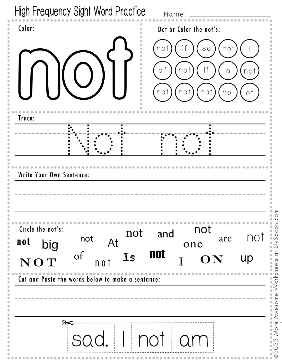 Each worksheet in this set helps children recognize, trace, write, and read the word not in interactive, memorable ways.