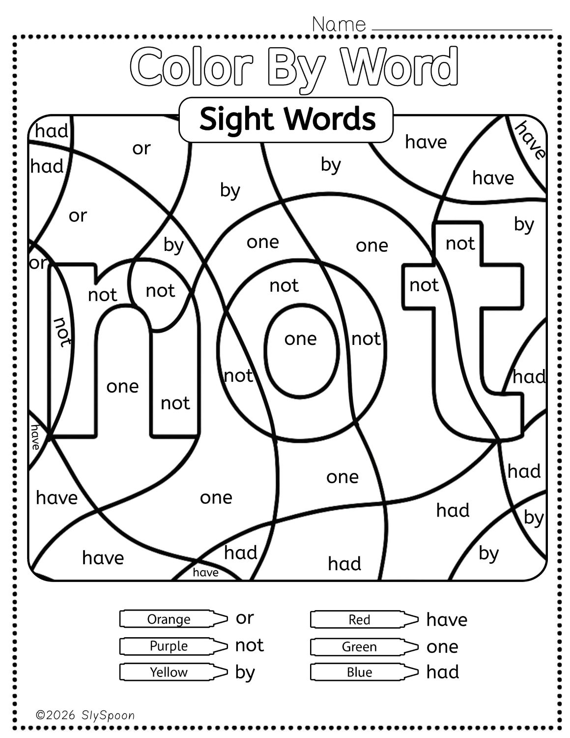 A color-by-number style activity that uses sight words instead of numbers! Kids color each space according to the word inside. When finished, the hidden sight word not appears.