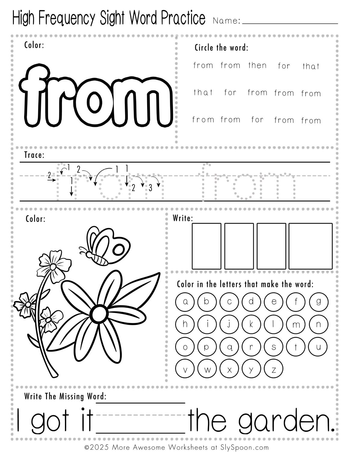 Children often come across this word in phrases like “from me,” “from here,” or “from the box.” Even though from doesn’t follow straightforward phonics rules, repetition builds confidence, and these worksheets offer plenty of playful exposure to help early readers succeed.