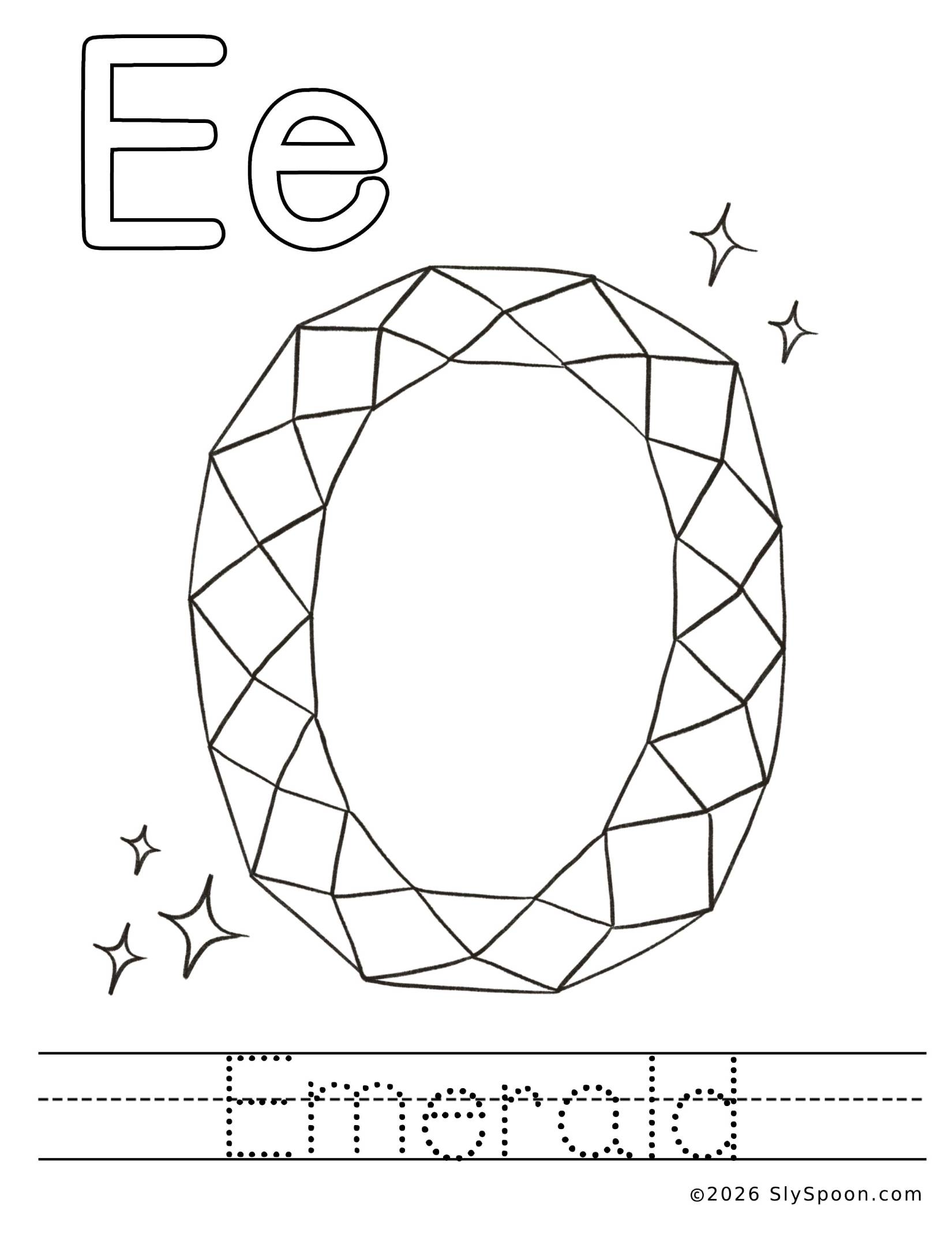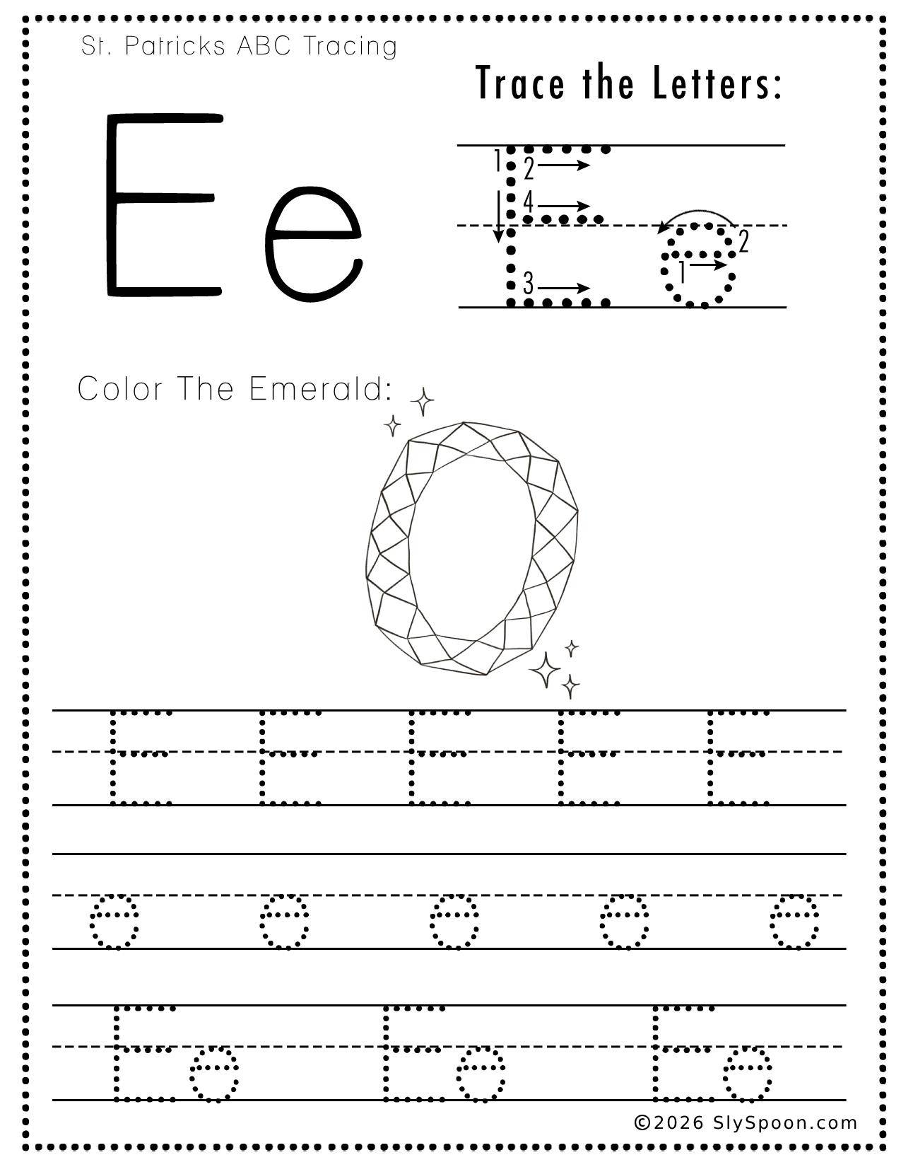 This post focuses on 5 free printable worksheets around the Letter E with a St. Patrick’s Day-themed emerald illustration. Emeralds are closely connected to St. Patrick’s Day because Ireland is often called “The Emerald Isle” thanks to its lush green landscape.