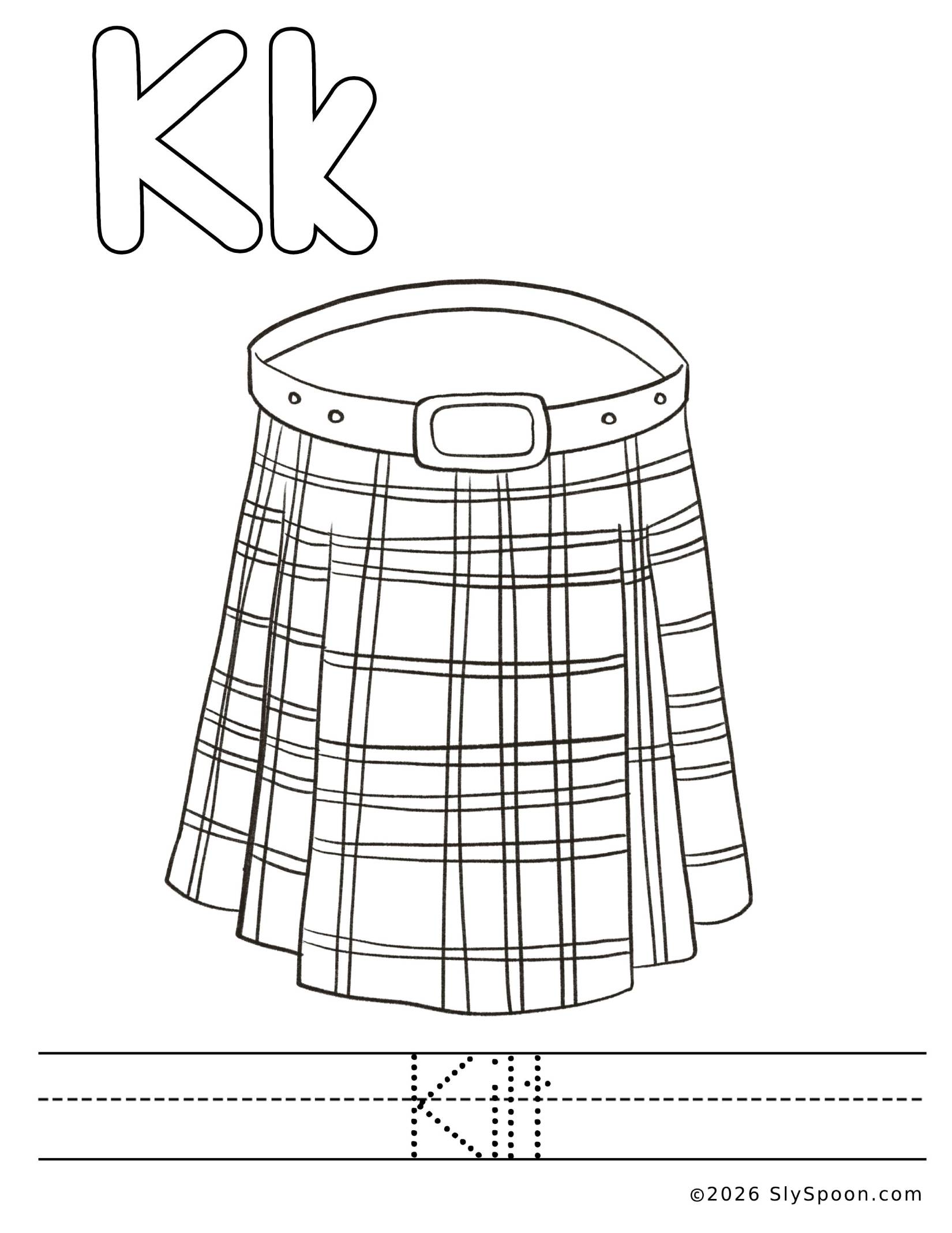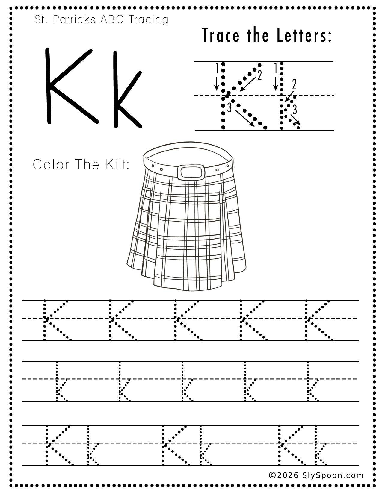 This post focuses on 5 free printable worksheets around the Letter K with a St. Patrick’s Day-themed kilt illustration. Kilts are most strongly associated with Scottish tradition, but they fit this holiday well because St. Patrick’s Day celebrations often include Celtic music, parades, and cultural symbols from the broader Celtic world.