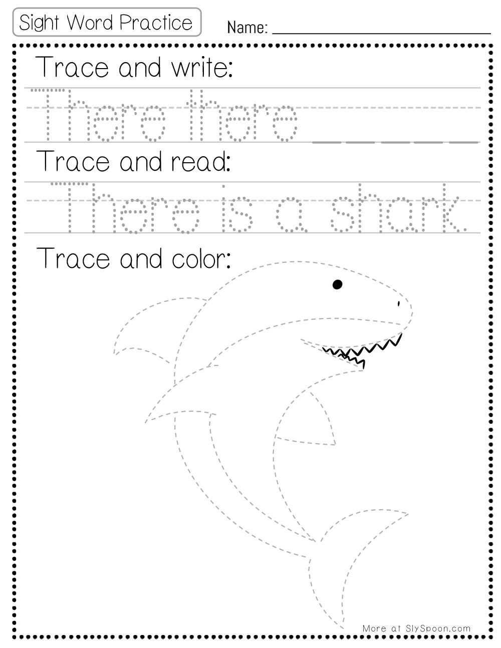 Each worksheet is designed to help kids recognize, trace, write, and read the word there through simple, meaningful practice.