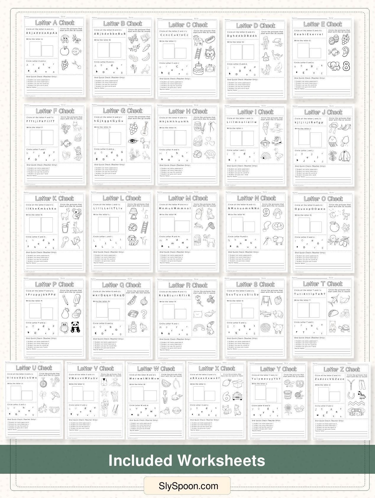 This printable pack includes 26 alphabet worksheets, one for each letter A–Z. Each page combines a variety of quick skill checks and activities to give teachers and parents a clear picture of a child’s progress—while still keeping learning fun and engaging.