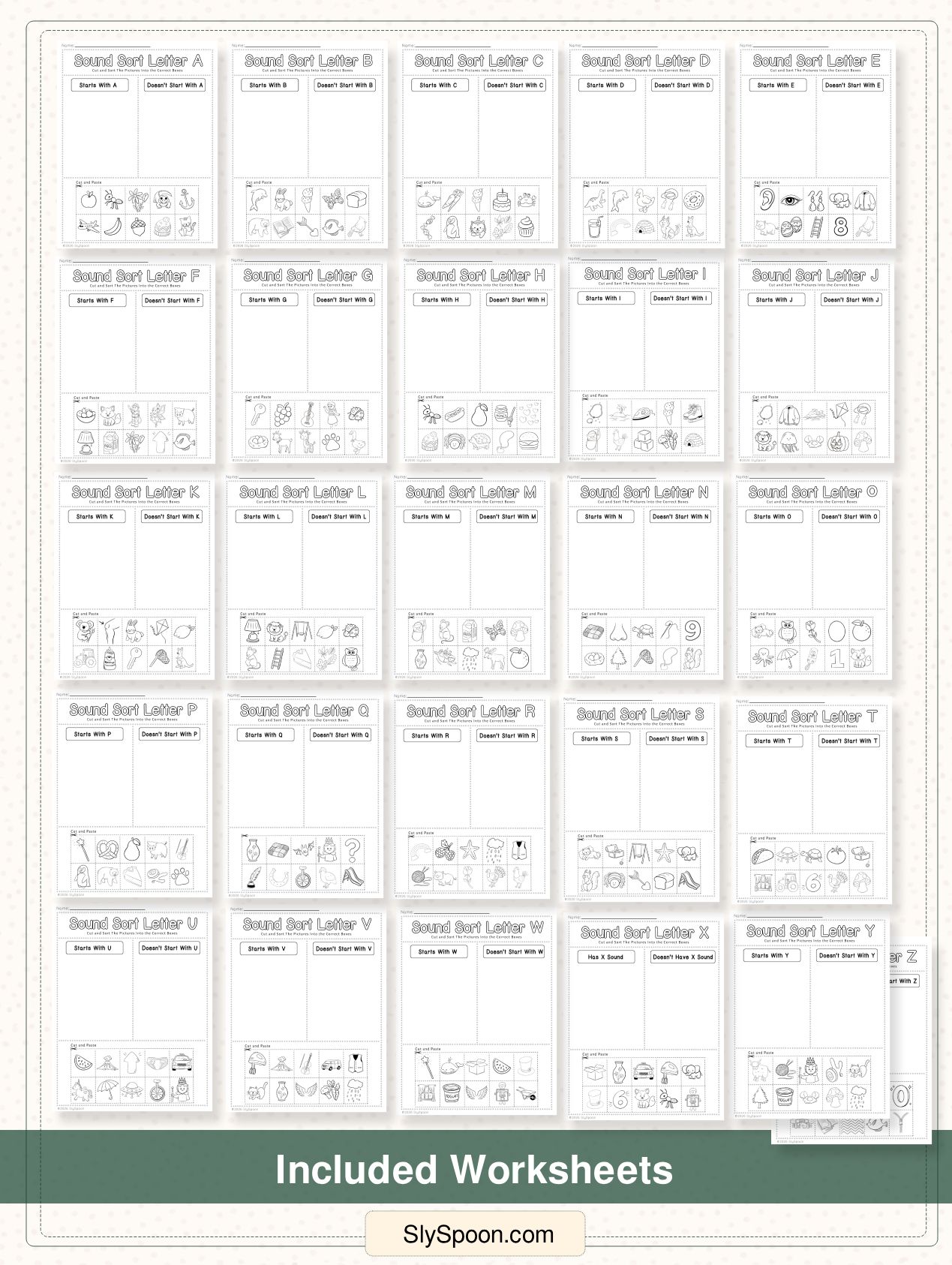 This printable pack includes 26 alphabet worksheets, one for each letter A–Z. Each page invites children to listen for the beginning sound of a word and sort pictures into the correct category.