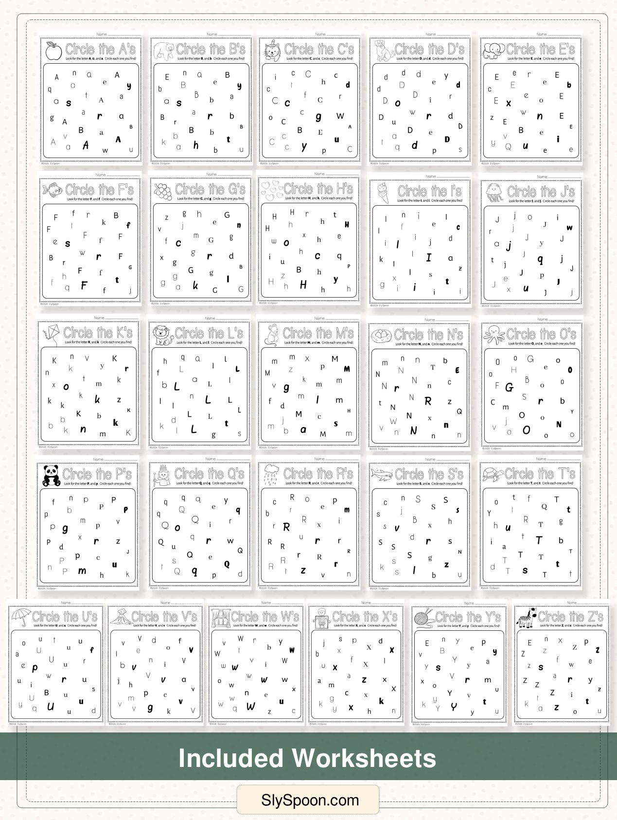 This printable pack includes 26 alphabet worksheets, one for each letter A–Z. Each page challenges children to find and circle the focus letter hidden among a mix of other letters.
